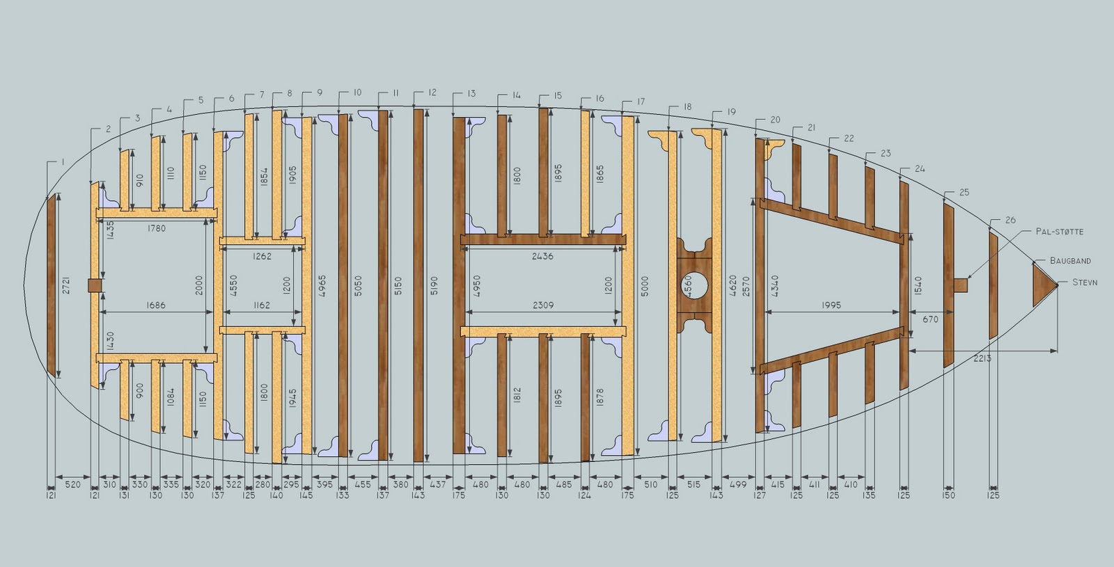 Gunnar har laget ei skisse over utskiftningene. Nye bjelker og knær er markert gule, materialer som beholdes er markert brunt – de grå knærne har vi ikke tatt stilling til ennå. Alle mål i millimeter.