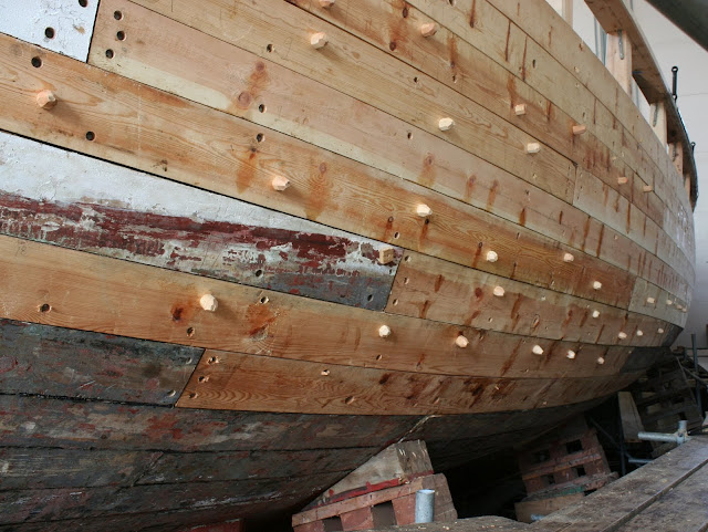 Babord side er ferdig oppbordet, og de fleste trenaglene slått inn.