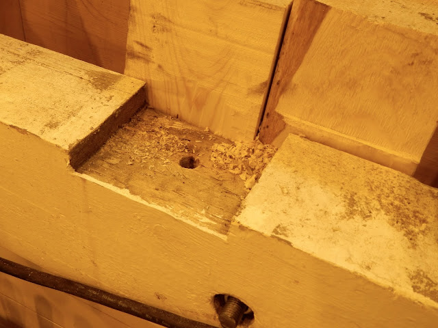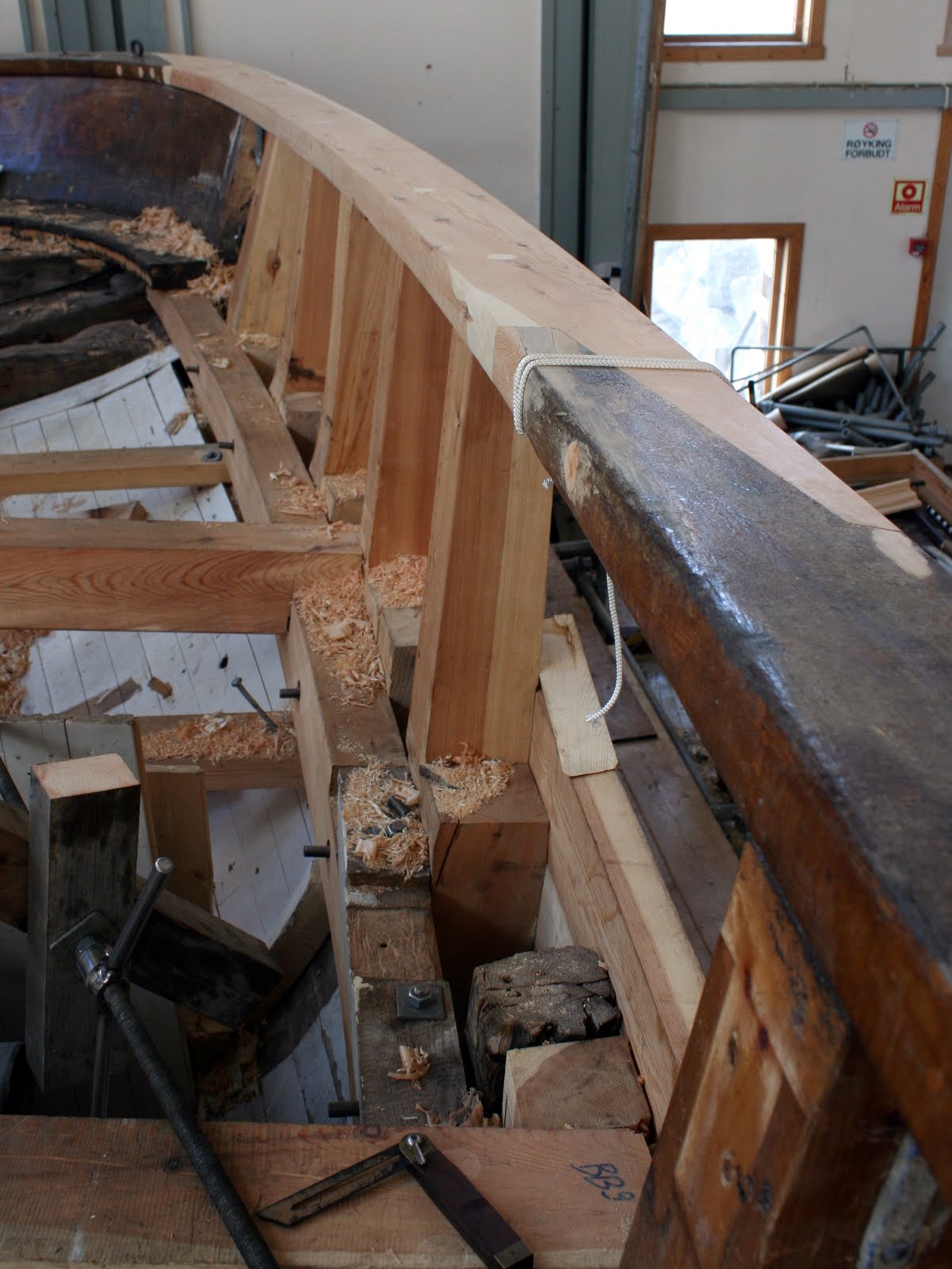 De soppangrepne delene av bjelkelaget er under utskiftning. Her er fremre romlukebjelke skiftet, og ny bjelkebærer (kravell) felles på plass.