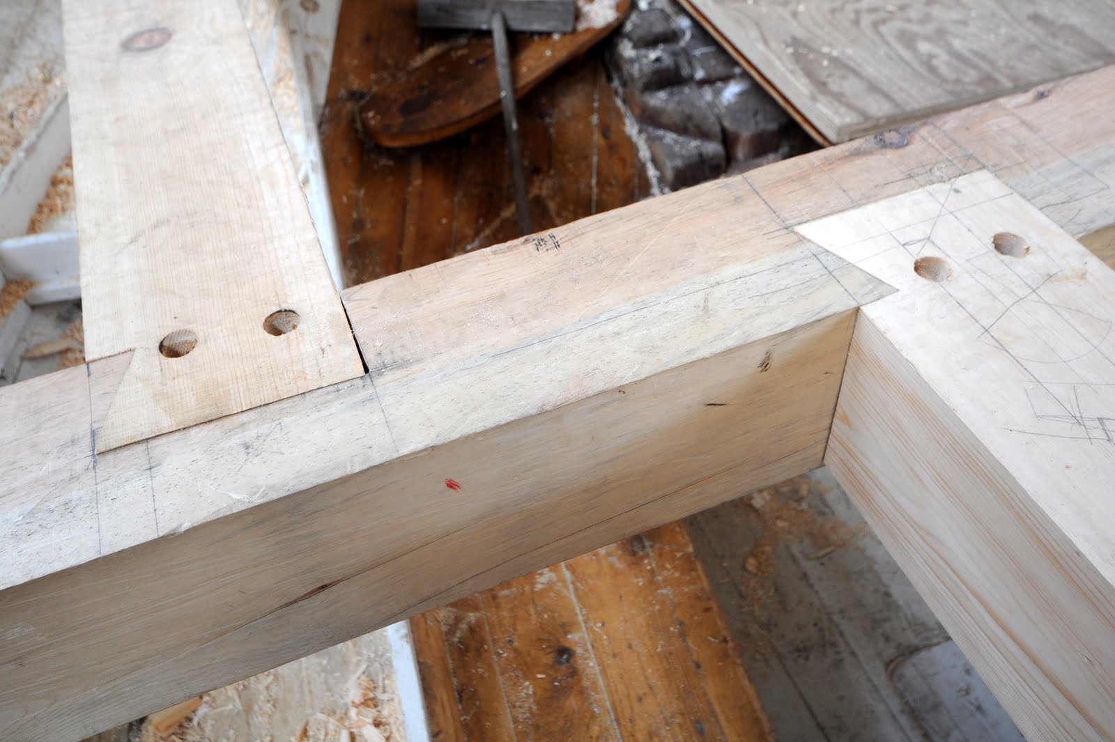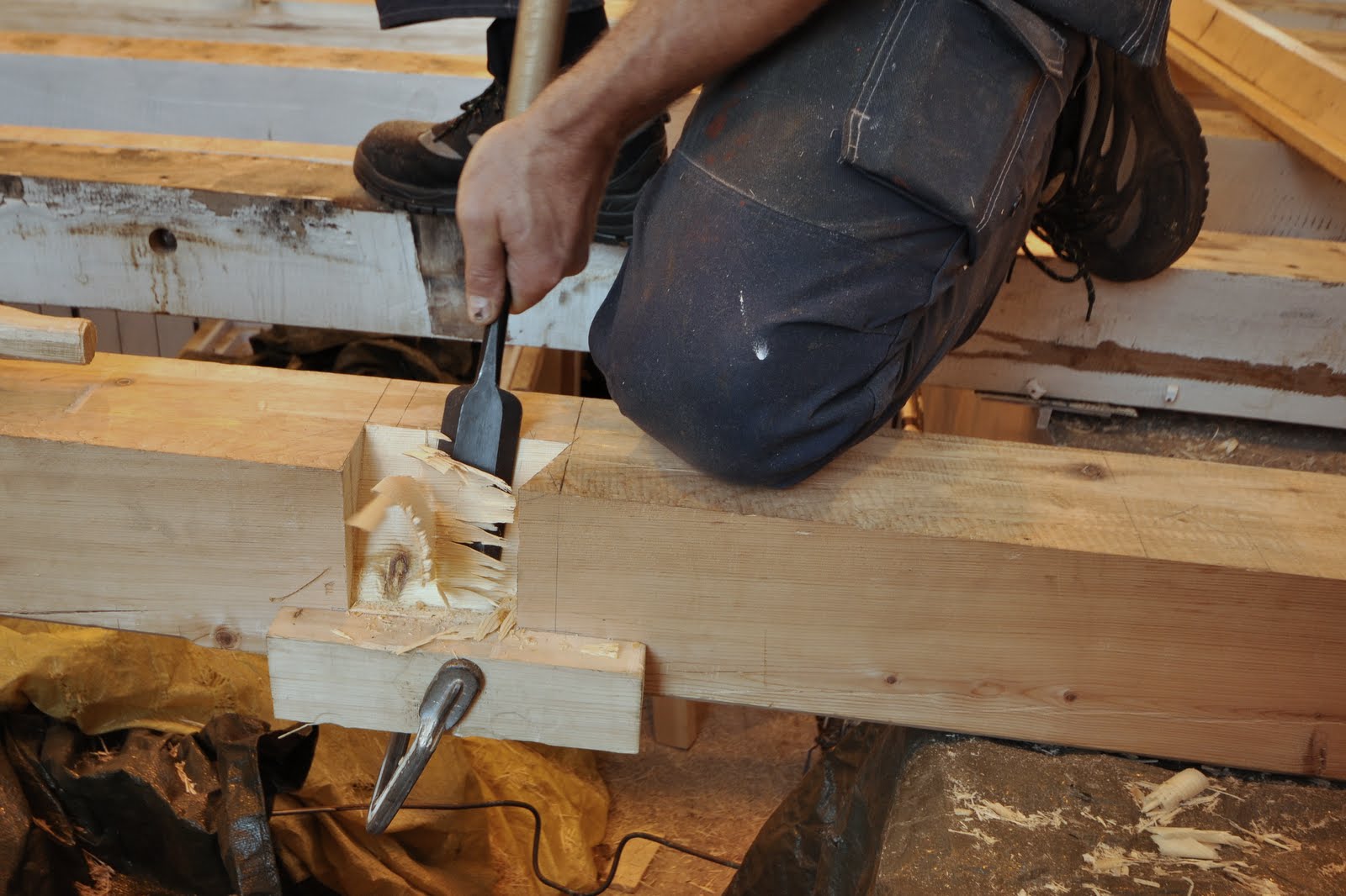 Her tilpasses fellingene til bjelkebærerne – enkle svalehaler. Klossen, som er satt fast med skrutvinge under fellinga, er både arbeidsanlegg for stemjernet og minker sjansen for uønsket oppflising.