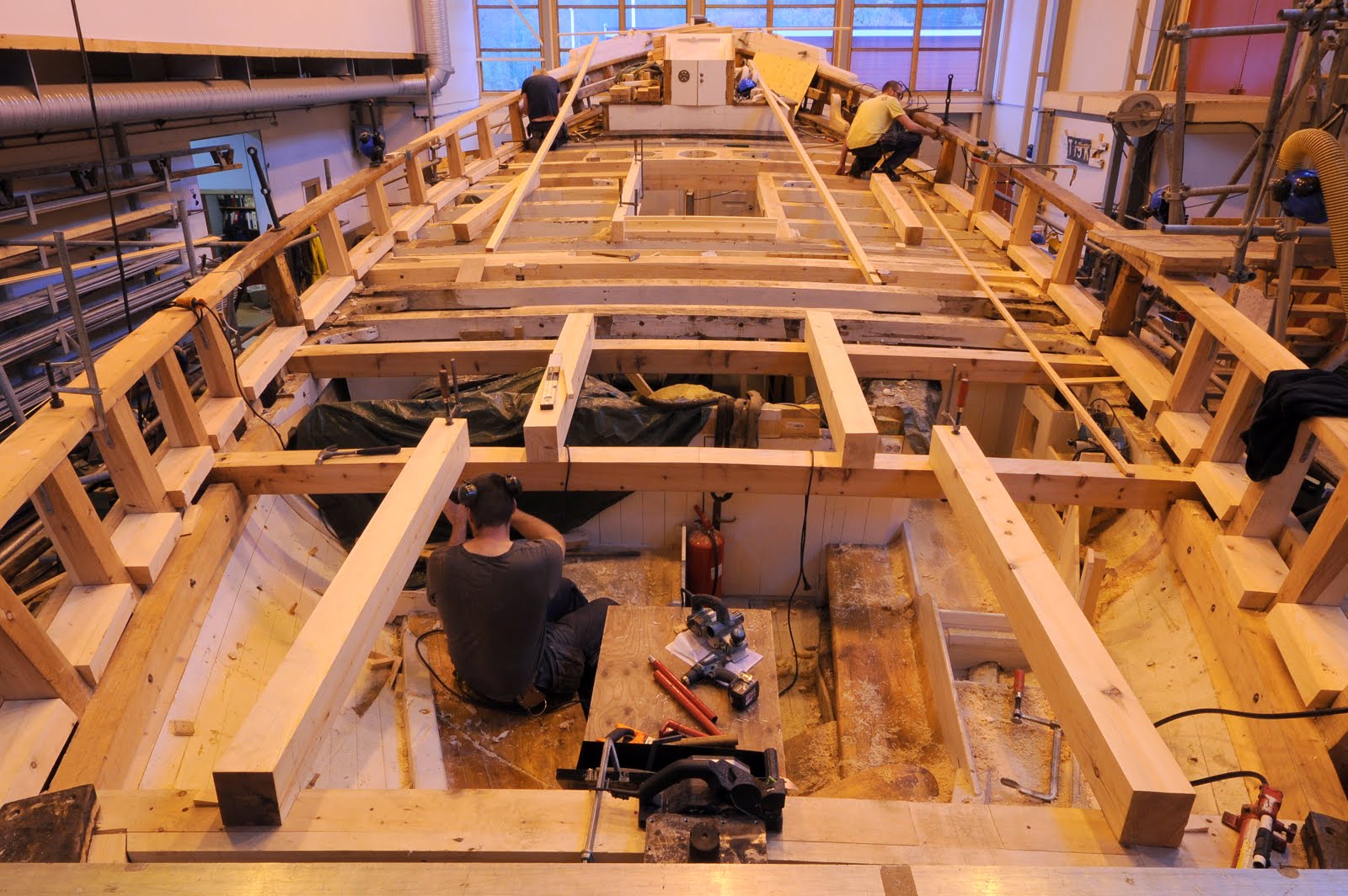 Fyllstykkene legges på sine respektive plasser etterhvert som de tilpasses mot skandekksplanken og rekkestøttene. Joost har lagt ut bjelkebærerne til det aktre dekkshuset. Dette strekker seg over to helbjelker til bjelken foran.
