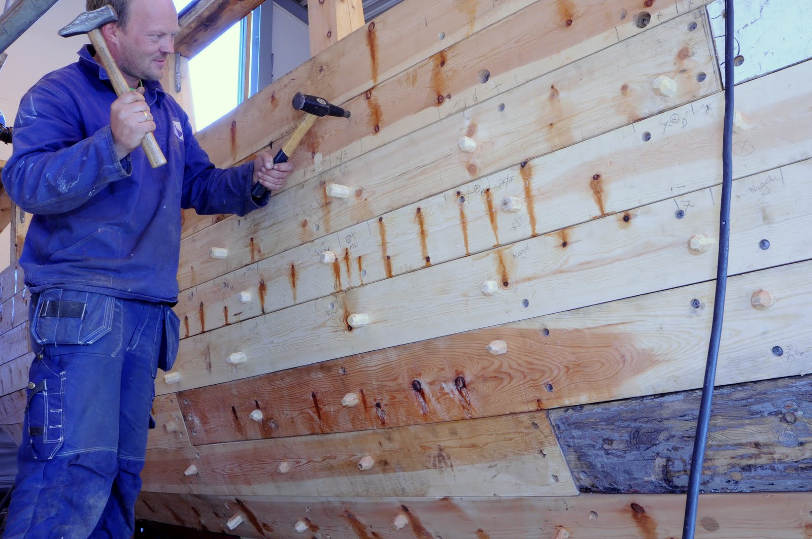 All plank i skroget er kommet på, men fullstendig innfesting gjenstår. Håvard spikrer bordgangene til spantene. Her benyttes dorhammer og smihammer.