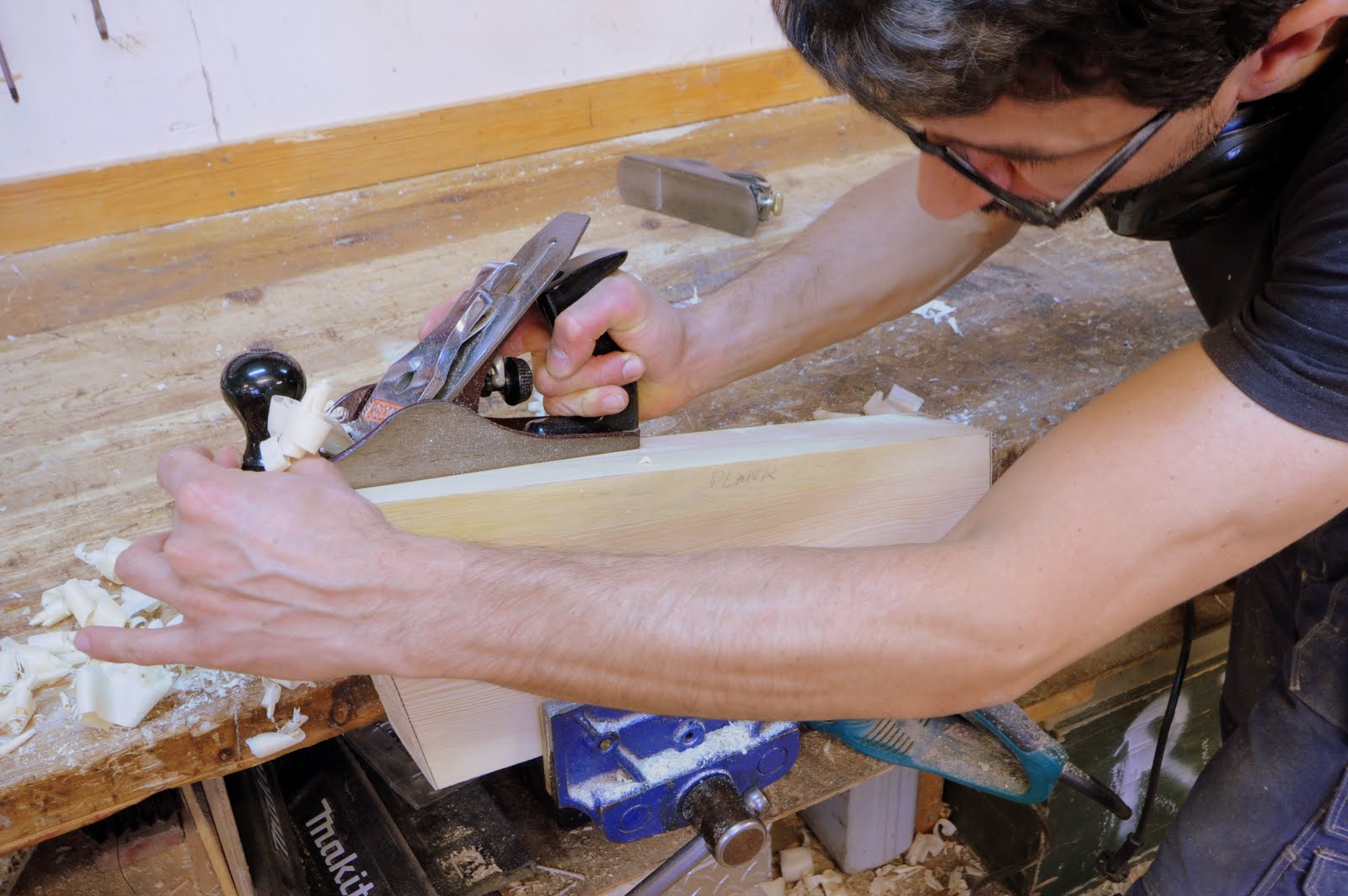 Maurizio høvler vinkelen ut mot skandekksplanken på et fyllstykke som skal sitte ved hekken på styrbord side.