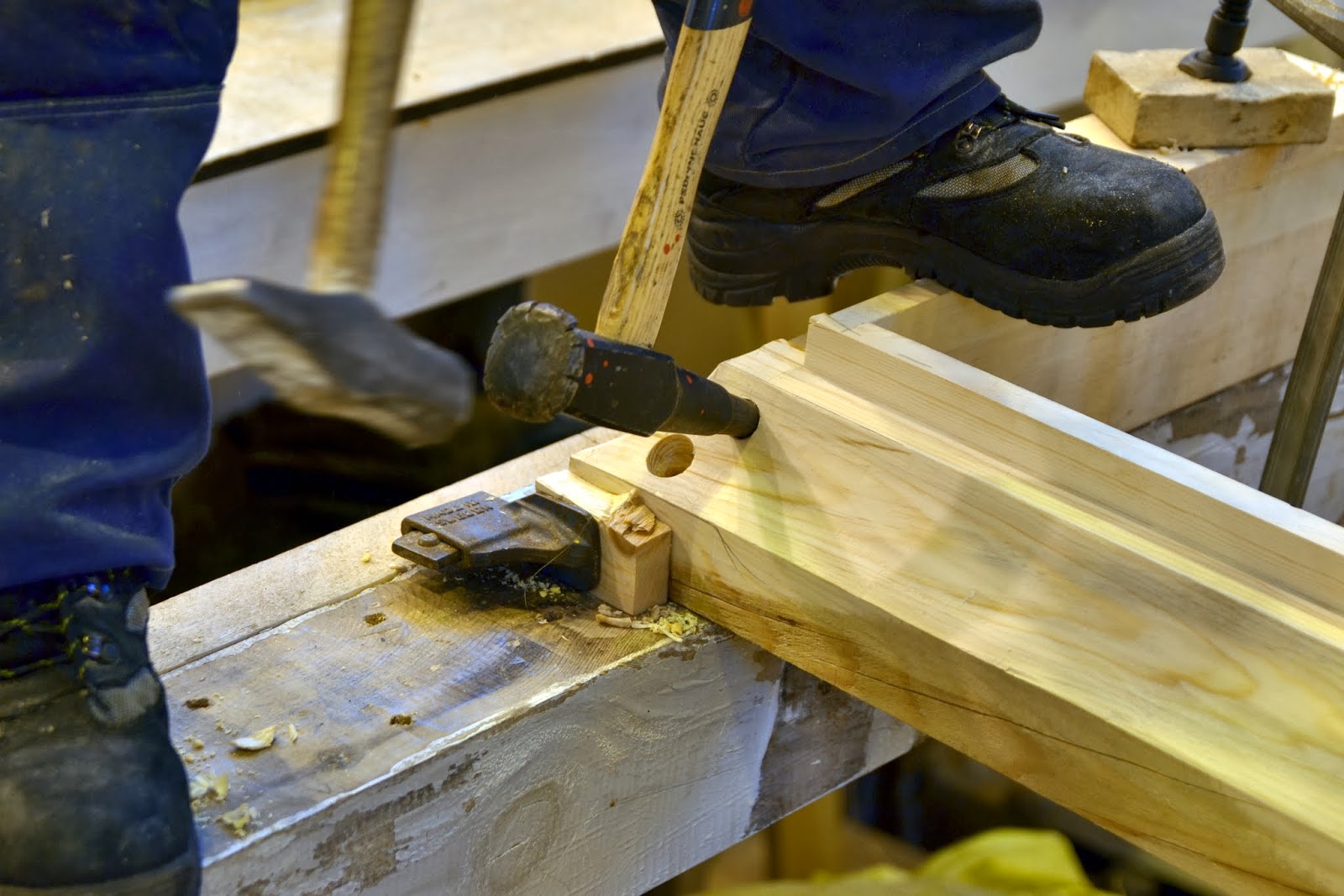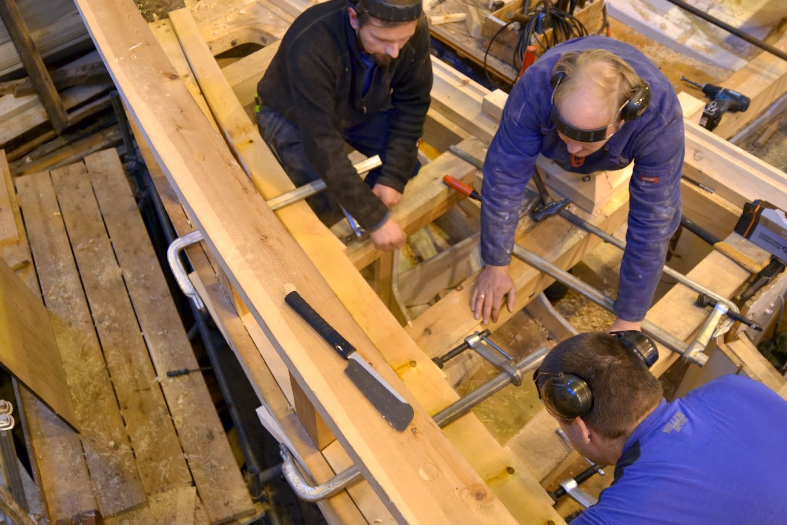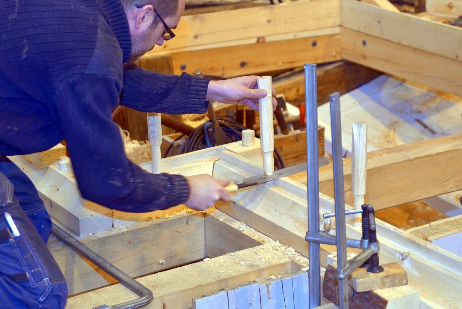 Fellinga på den ene bjelken og kneet begynner å bli ferdig. På bjelkene aktenfor ser vi at innerkanten av fellingene er saget ut, og dybden merket av med blyant.
