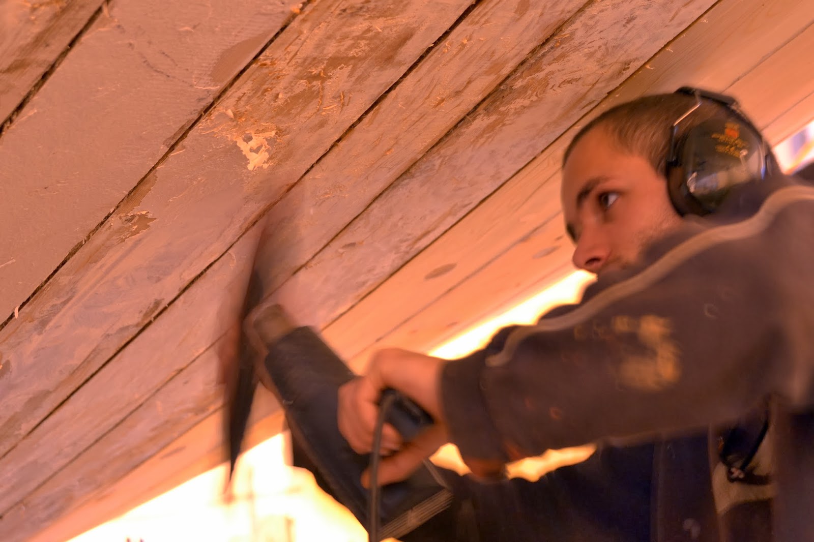 Under hekken skraper Wisse maling. Her er nokså tjukke strøk, så varmepistolen er til god hjelp.