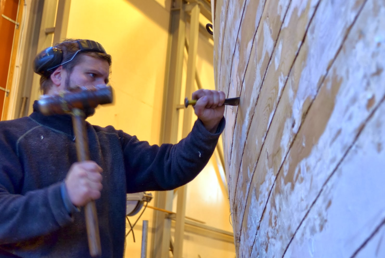 Drivreima forut på sb-side er også kommet ombord og i ferd med å tvinges på plass. Her får den seg noen kakk med slegga slik at den kommer på plass i lengderetninga.