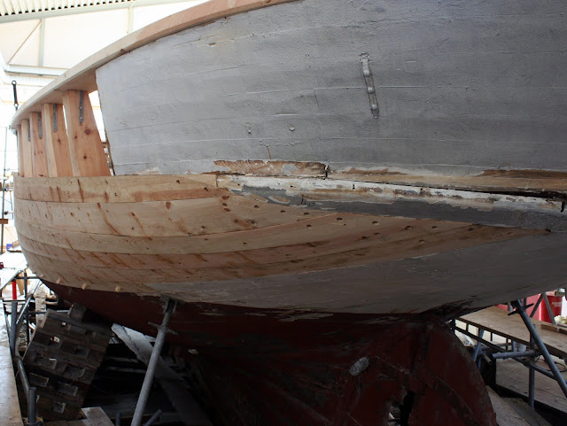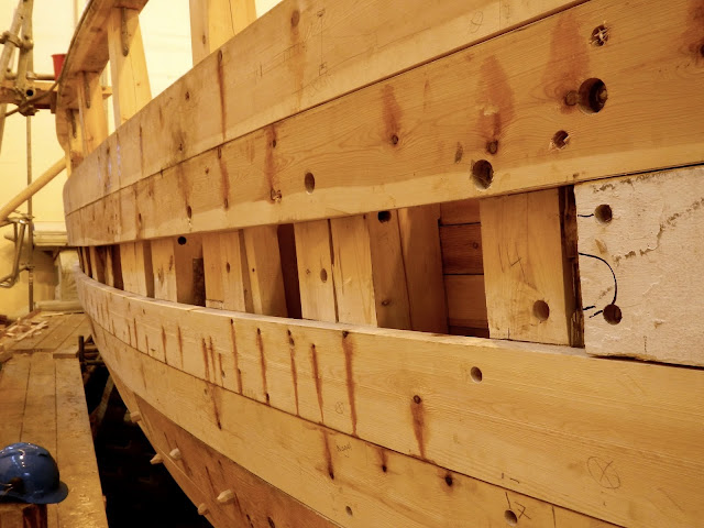 Babord side er ferdig oppbordet, og de fleste trenaglene slått inn.