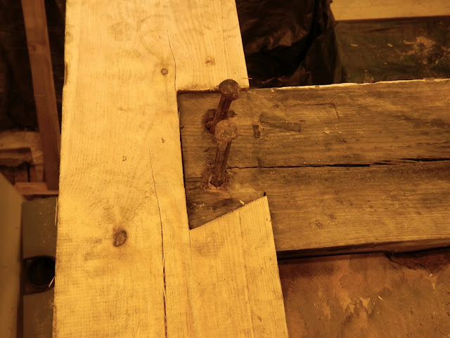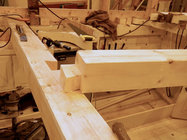 De soppangrepne delene av bjelkelaget er under utskiftning. Her er fremre romlukebjelke skiftet, og ny bjelkebærer (kravell) felles på plass.