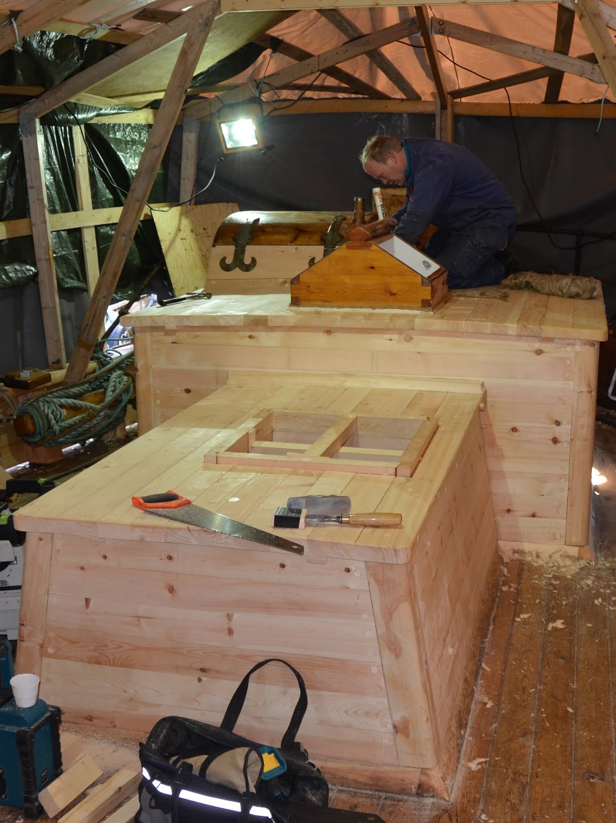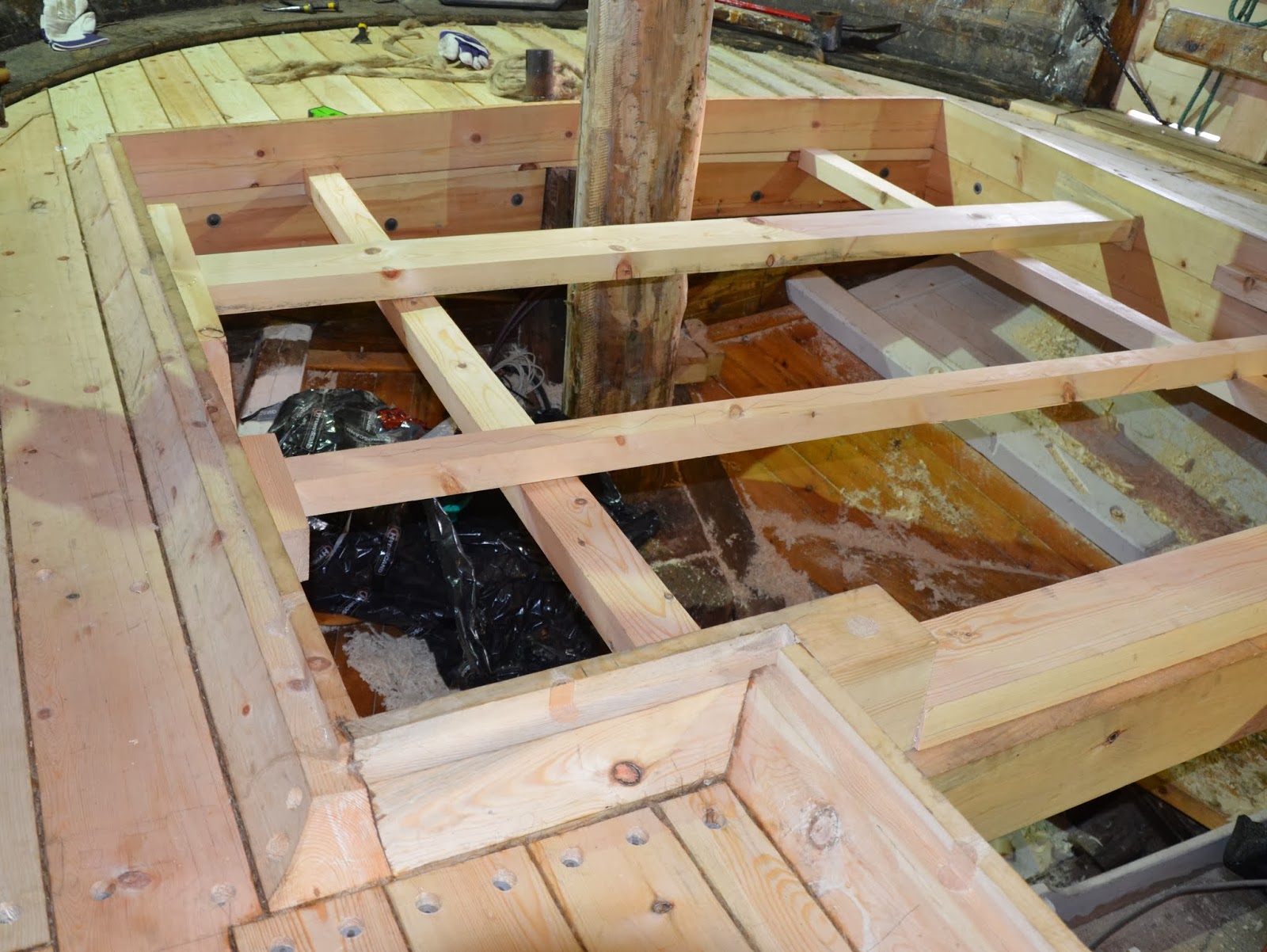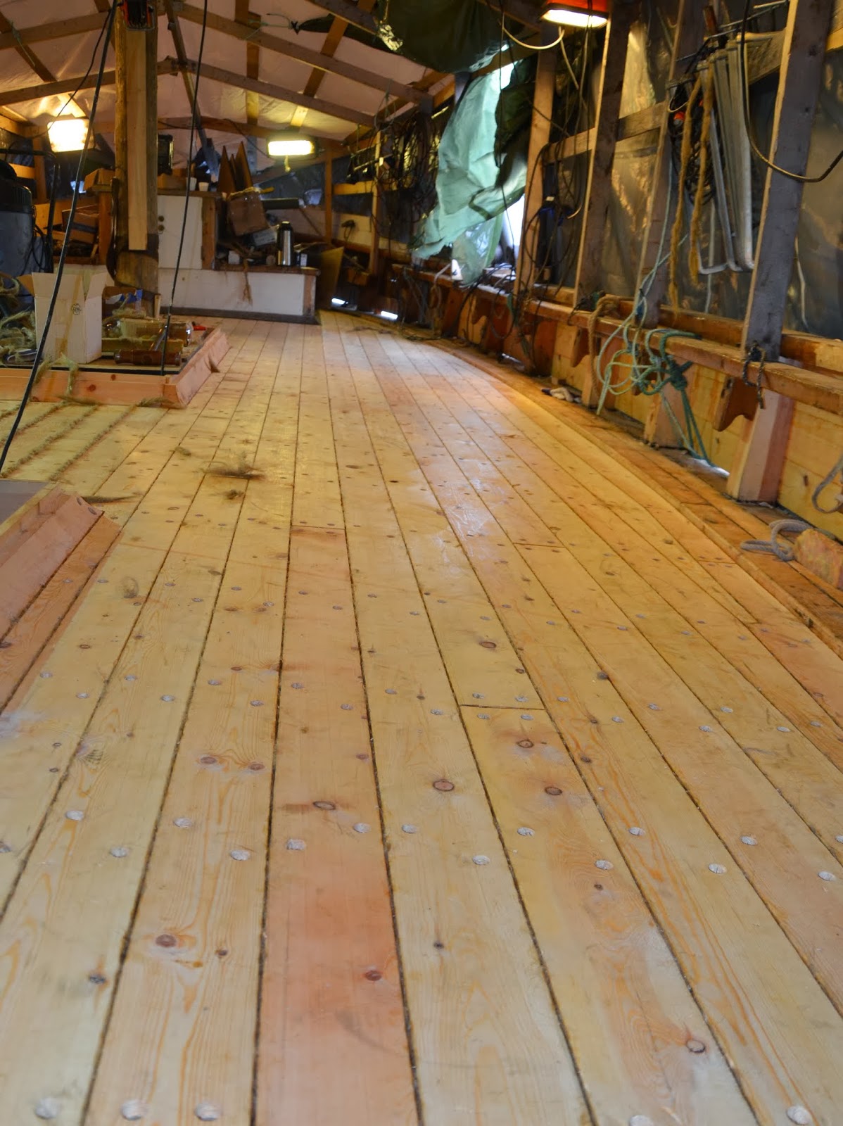 Dekket på Folkvang er ferdig lagt og drivinga er i god gjenge. Arbeidslaget under ledelse av Endre Lund har stått godt på siden oppstarten for en måned siden. Målsettingen er å få ferdig vår del av jobben så tidlig som mulig på vårparten, slik at eierene kan rigge og klargjøre fartøyet for seilas til Kystens Landsstevne i Oslo i juli.