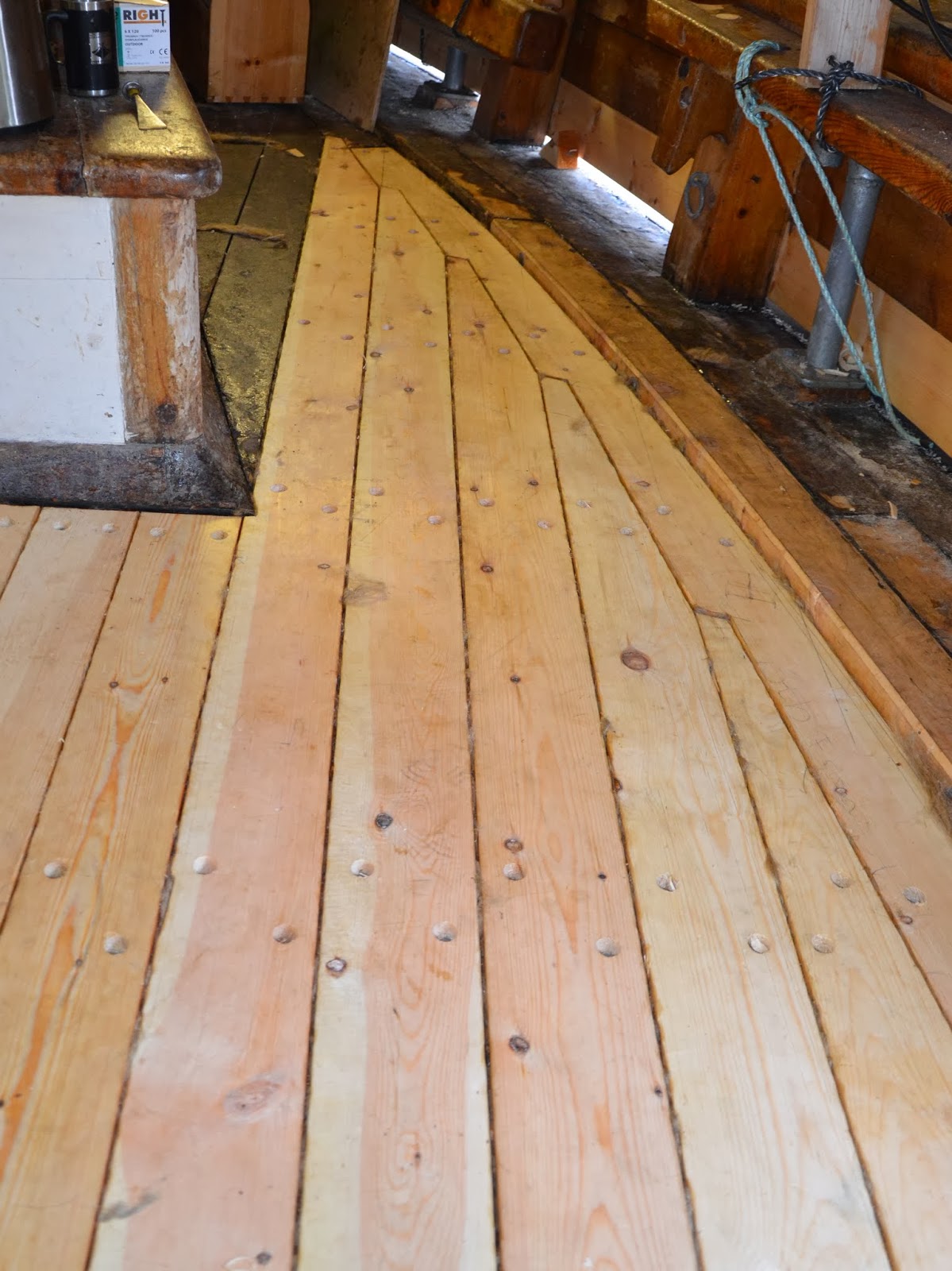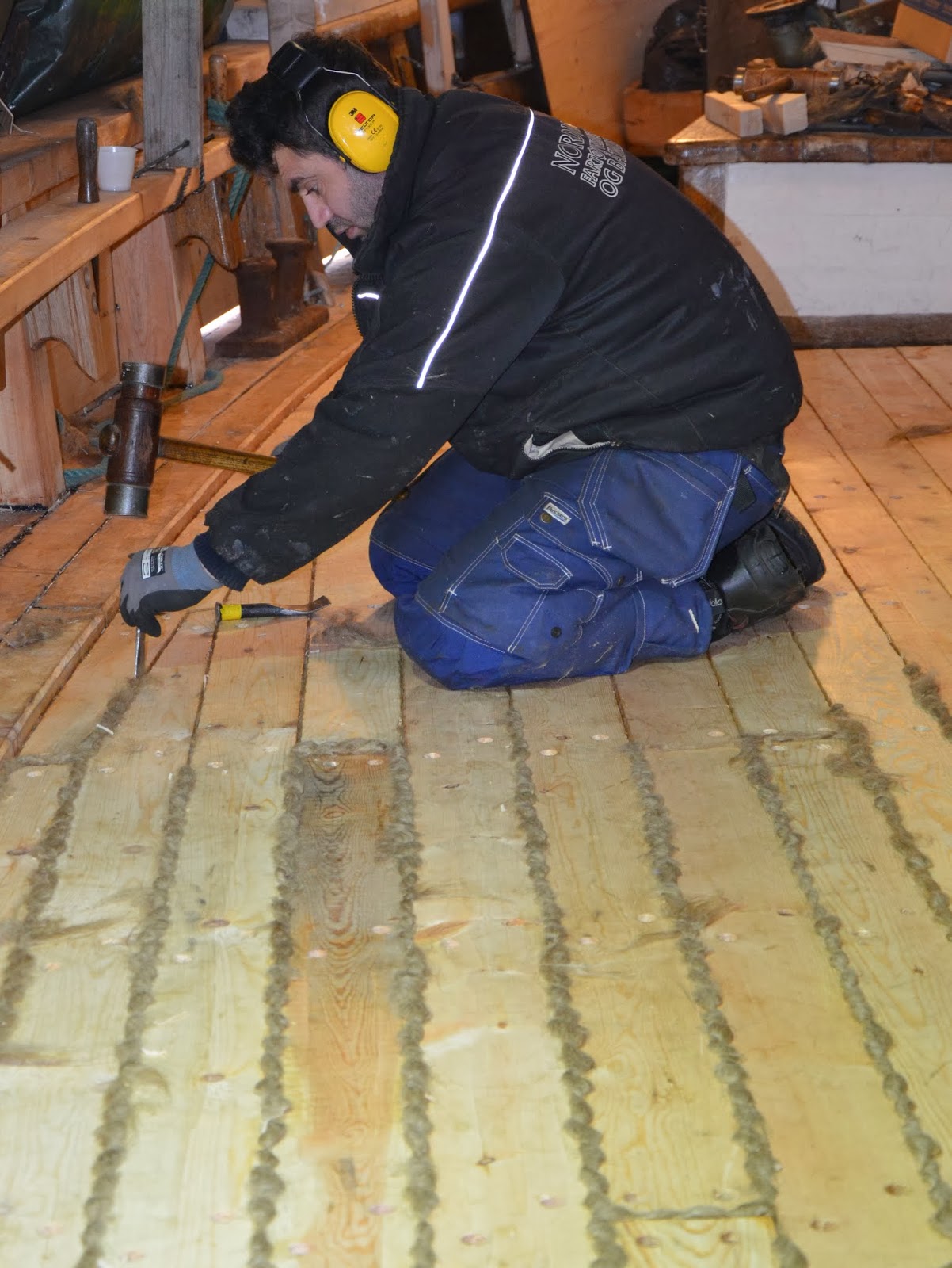 Totalt er det skiftet 261 meter dekksplank på Folkvang. Dekket har dimensjon 2 x 5 toms og drives med to tråder før beking på tradisjonelt vis.